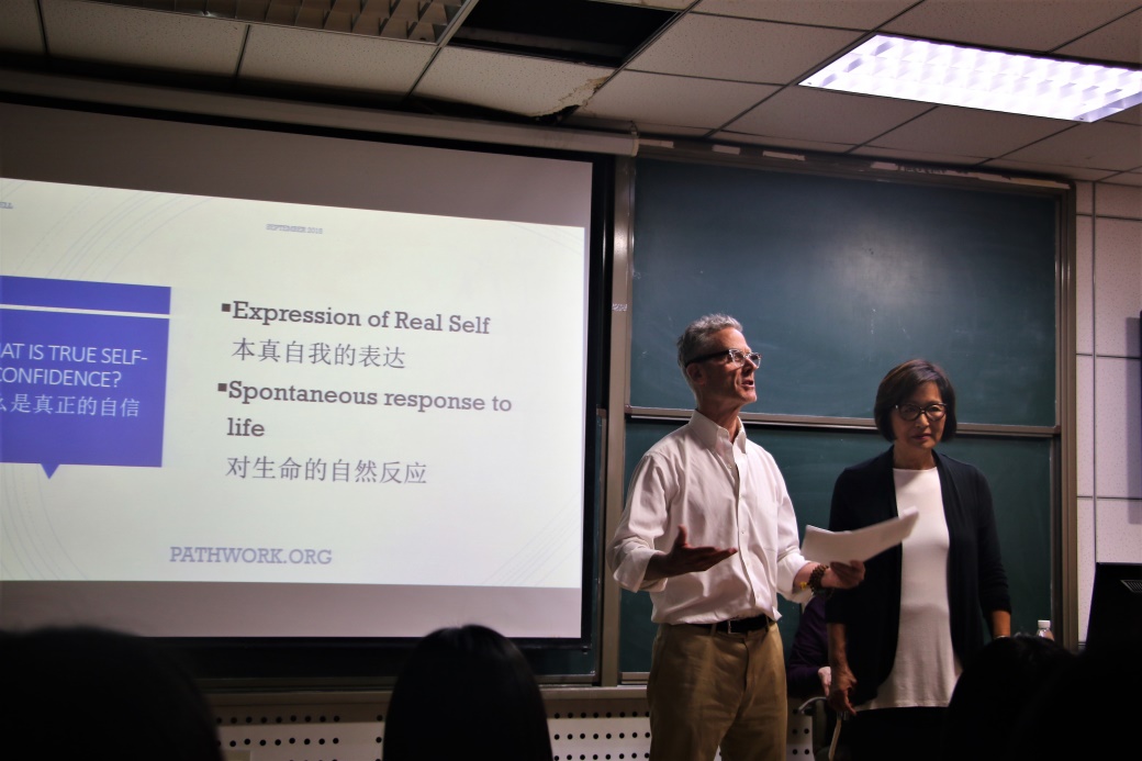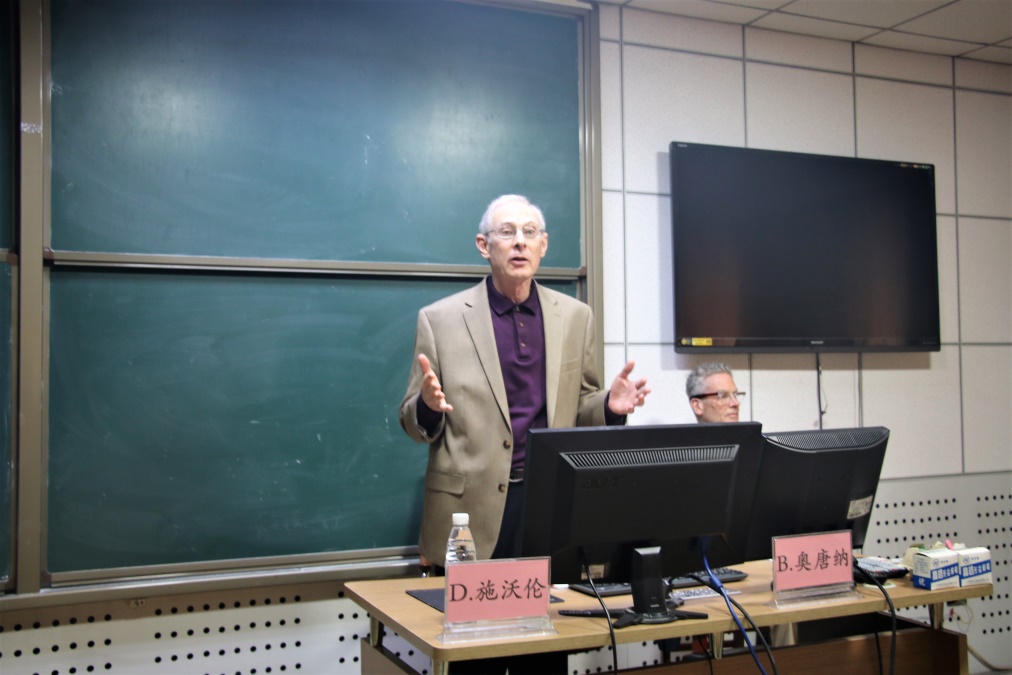对D.施沃伦和B.奥唐纳两位专家的到来表示欢迎,并就两位专家的研究领域做了简要介绍。随后,D.施沃伦博士和B.奥唐纳博士围绕“心路治疗视域下的恐惧与自信”给在座师生做了精彩的报告。报告以大学生感兴趣的例子为切入点,深入、系统的介绍了恐惧与自信的来源及其治疗方式。