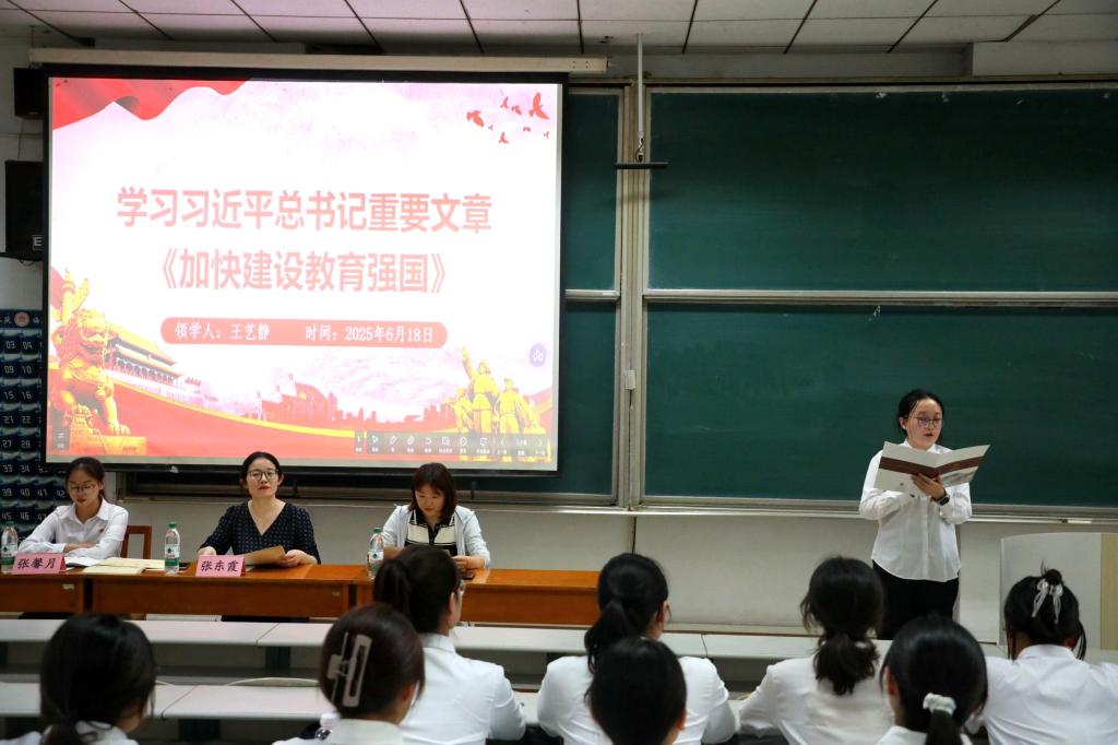 会上,团委组织部部长王艺静带领全体学生干部学习《加快建设教育强国》,助力学生干部深刻领会教育强国战略的核心内涵与实践路径,清晰锚定学生干部所肩负的使命重任与履职方向,明晰责任边界,以青春之为赋能教育发展新篇。