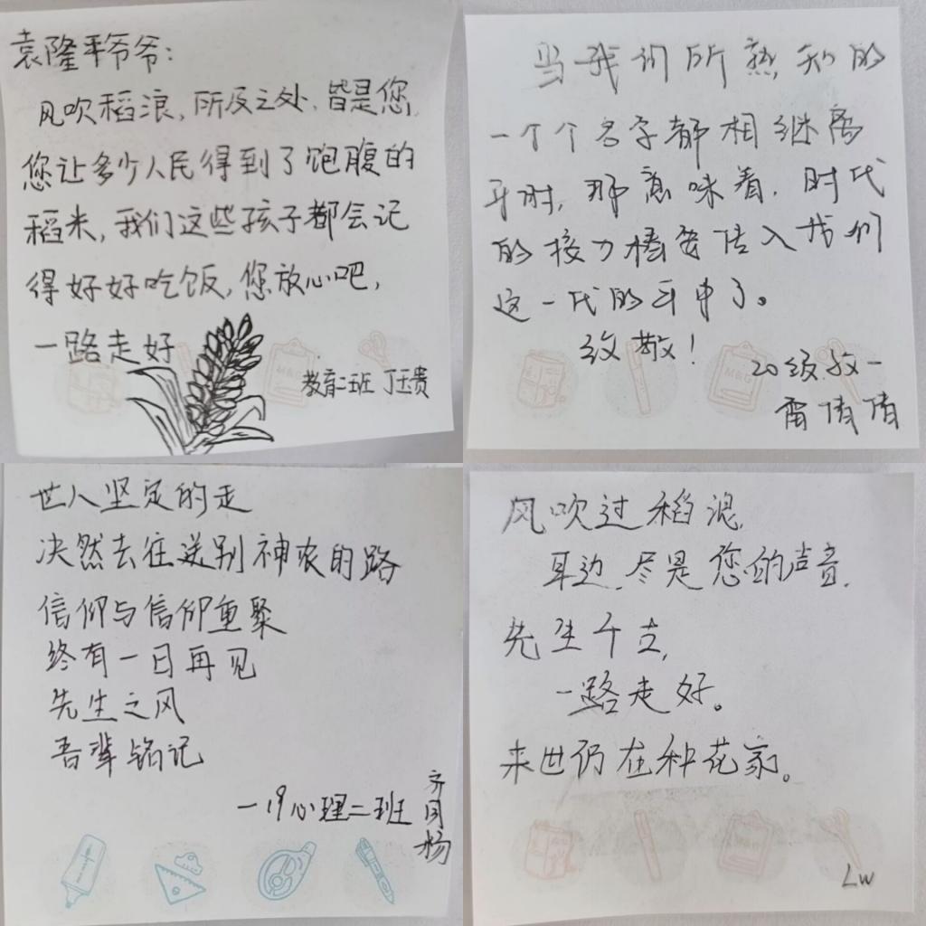 活动过程中,同学们积极参与,怀着无比深厚的敬仰之情,用纸笔认真书写下自己对前辈的缅怀和追思。最后,同学们将自己的寄语粘在展板上,表达了对四位国之栋梁的哀思之情。