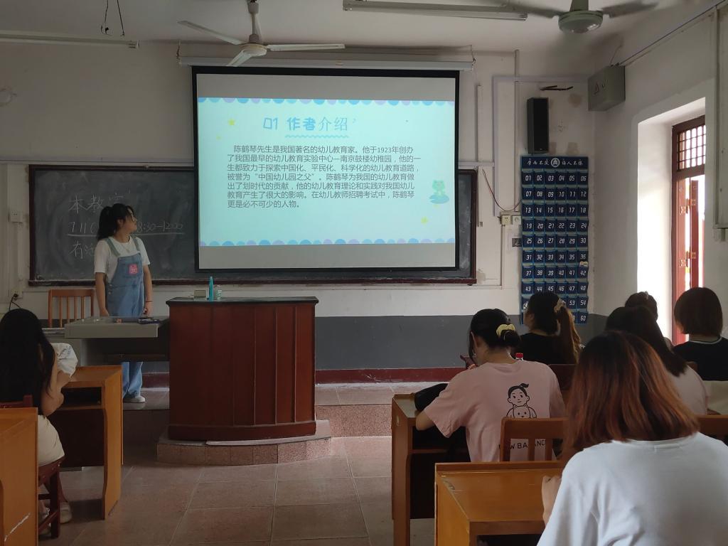 2019级学前教育班的黄晓萌同学和我们分享的书籍是《活教育》。她主要从作者介绍,内容介绍,感悟体会三方面进行分享,重点从儿童教育与活教育实验、活教育思想、活教育的理论体系、活教育教学四方面深入介绍了陈鹤琴的幼儿教育的理论与实践。