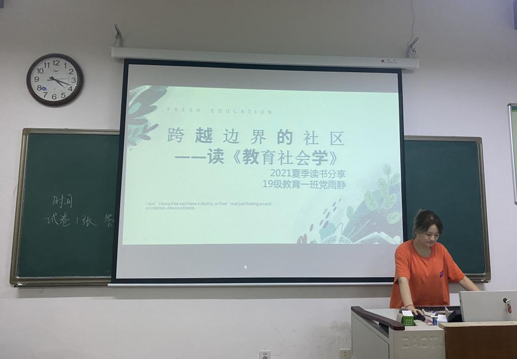 2019级教育一班的党羽静同学分享的书籍是《教育社会学》。她从教育与个体社会化、教育与社会民主、教育与社会变迁、教育与社会分层和社会流动四方面,探讨教育社会学的实质是从环境角度研究人的教育行为,打破学科之间的边界,同时跨越个体发展中的社会化边界,通过教育促进个体社会化和社会发展,在新的社会背景下培养更优秀的人才,推动社会向前发展。
