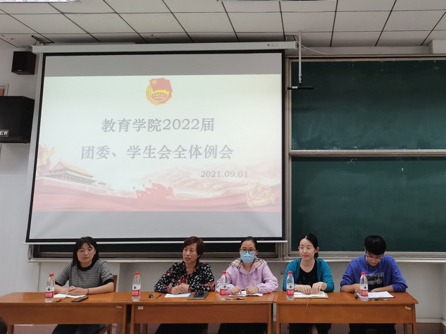 2022届团委、学生会全体例会在综合楼201教室顺利召开。出席本次会议的老师有团委书记周长缨、2018级辅导员王保英、2019级辅导员张东霞和商雪敏。本次会议由学生会主席庞霄汉主持。