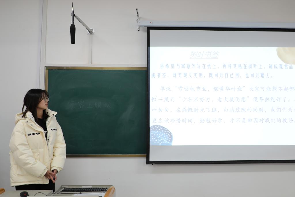 本次活动共分为三个环节。首先,参赛选手依次上台展示参赛作品,阐释自己的设计理念。选手们凭借天马行空的想象力,通过绘画、拼贴等方式创作出新颖奇特、栩栩如生的创意作品,表达对秋日曲园的喜爱之情。随后,参赛选手进行落叶茎部韧性比拼,在轻松愉快的游戏中活跃了现场气氛。最后,评委们结合参赛选手表现进行点评与打分。评委们肯定了参赛选手的巧妙构思,同时指出不足之处。经过评选,庄媛、郝玉彤等荣获一等奖;崔景博、张文倩等荣获二等奖;李文晓、赵一凡等荣获三等奖。