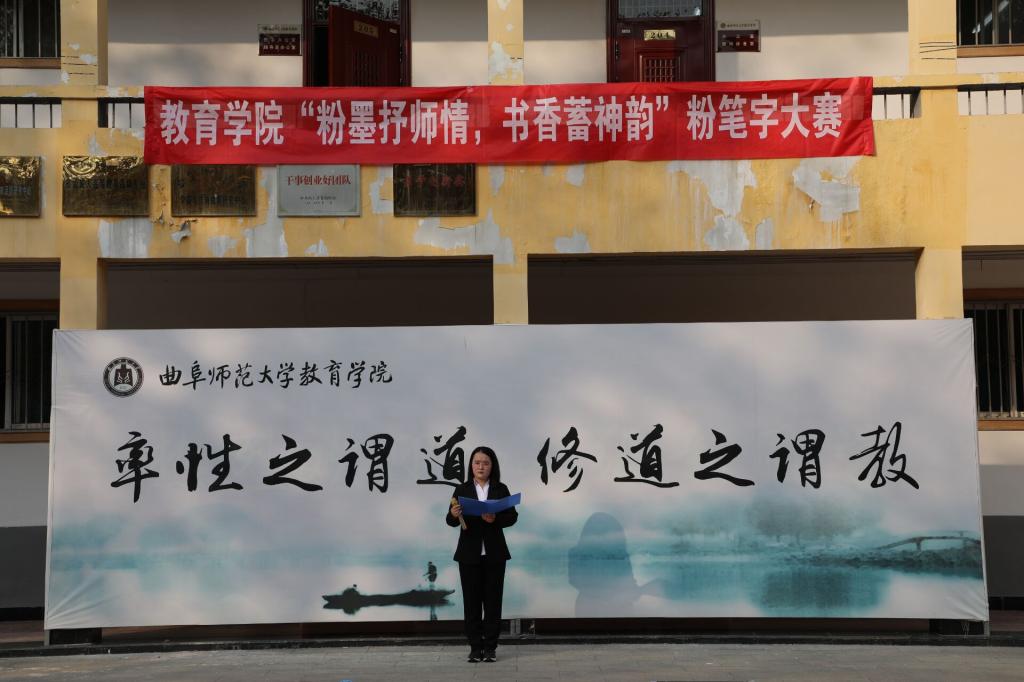 为强化师范生教学技能,提高师范生培养质量,展现师范生良好的专业素养,11月17日,女子足球直播 学生会学习部、宿管部在女子足球直播 楼前举办“粉墨抒师情,书香蓄神韵”粉笔字大赛。女子足球直播 党委副书记孙超出席活动,团委书记周长缨,辅导员王保英、张东霞、商雪敏参加活动。本次比赛特邀书法女子足球直播 徐可然老师,兰亭书社社长李思娜和部分社员担任评委。