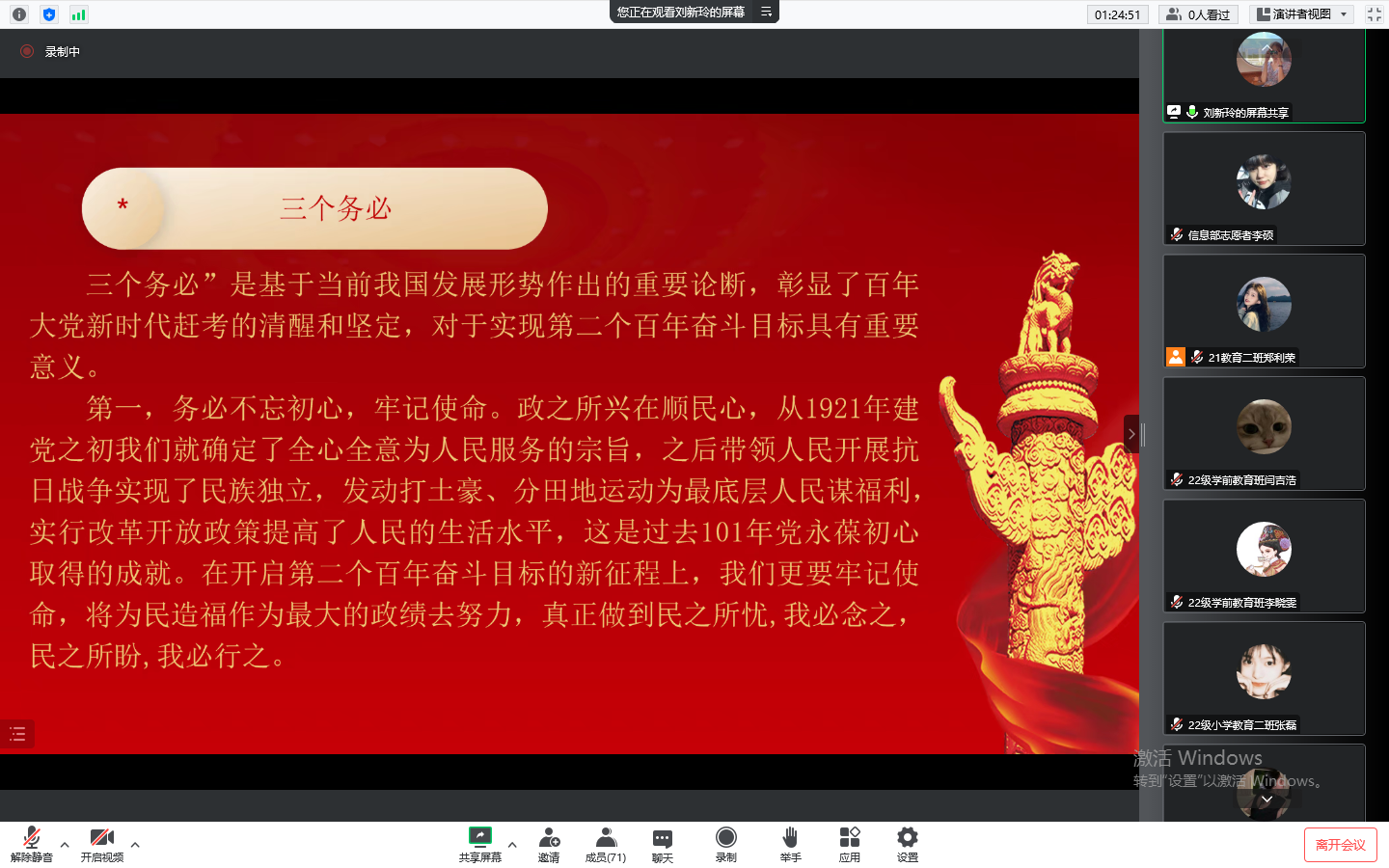 同时,她希望全体学生干部务必不忘初心、牢记使命,深刻领悟学习“三个务必”的内涵和要求,并将其融入到自己生活和工作的实践中来,树立清晰的职业目标,坚守“孺子牛”初心,虚心向他人学习,提高综合能力,直面矛盾和困难,踏踏实实地做好本职工作。