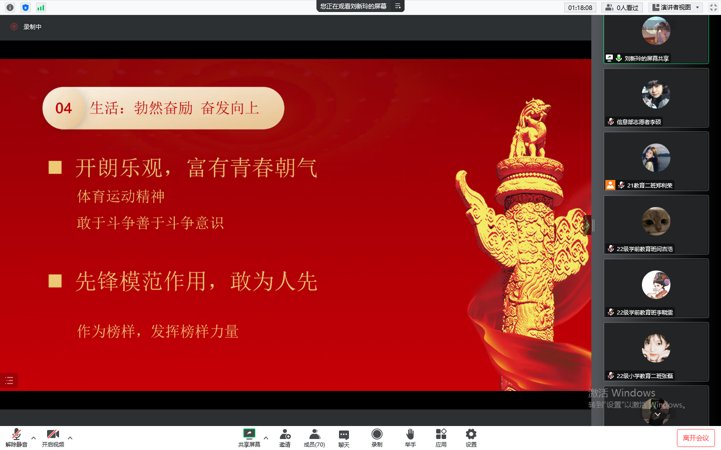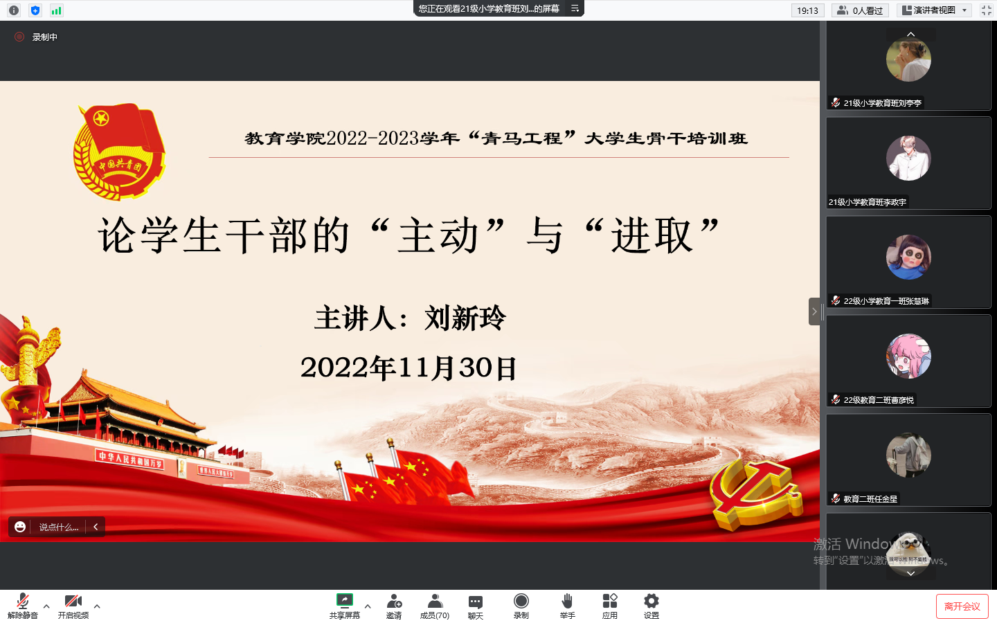 刘新玲以“论学生干部的‘主动’与‘进取’”为题,围绕学生干部工作主动和进取两个方面,结合个人学习成长经历和新时代学生干部的学习、工作、生活实际,对学生干部进行了深入的思想教育,对大家今后的学习、工作和生活提出了宝贵的指导性意见。
