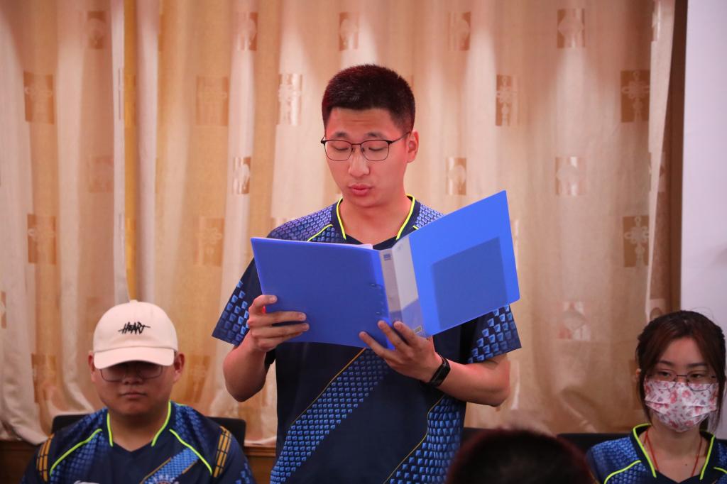 副队长邓明鑫同学发言,作为一名乒乓球队队员,他向教练与师哥师姐的指导帮助表示真诚感谢。他表示将和队员们一起以更加饱满的热情和昂扬的斗志投入到训练当中,全心全意为女子足球直播