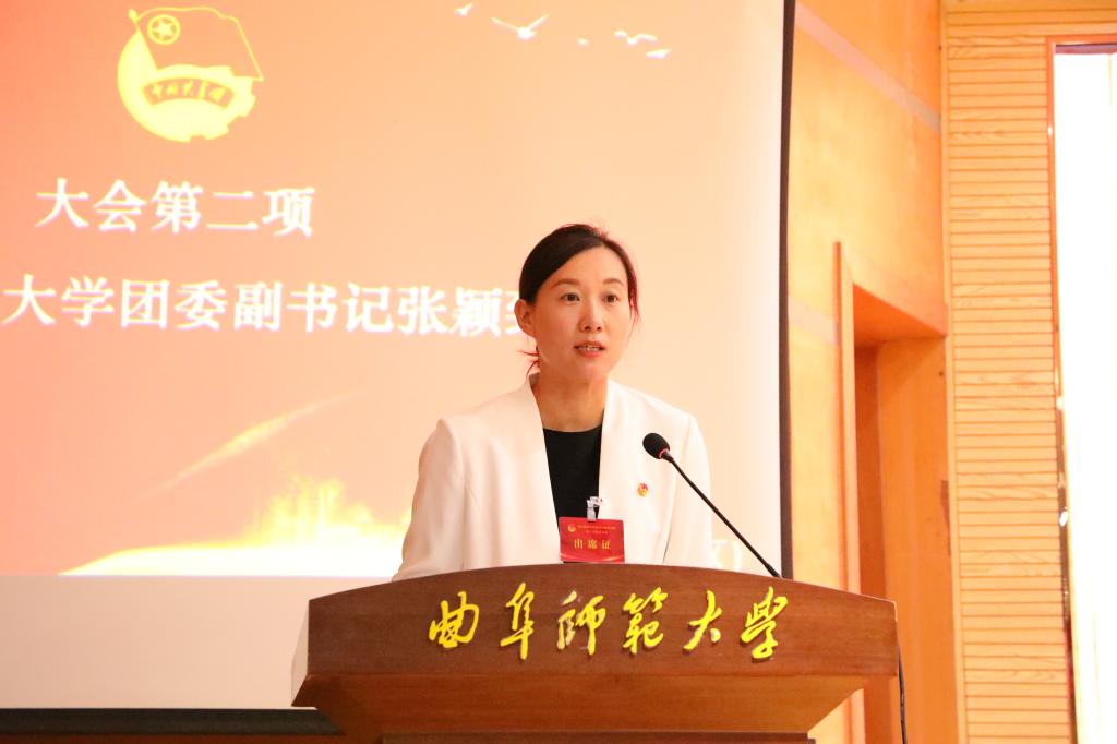 张颖代表共青团曲阜师范大学委员会向大会致辞。她指出,受孔轶众书记和学校团委委托,向大会的顺利召开表示热烈祝贺。团代会的召开是对共青团工作的阶段性规划和总结,是推进落实高校团学组织改革的必要内容。她充分肯定了女子足球直播
