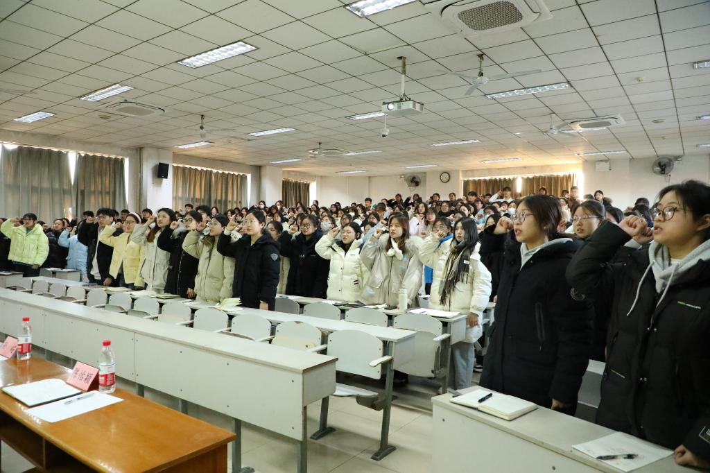 全体学生干部举起右拳,庄严承诺服从考试安排、严守考试纪律,争创更好成绩。誓言铿锵有力,彰显出同学们对诚信考试的坚定决心。
