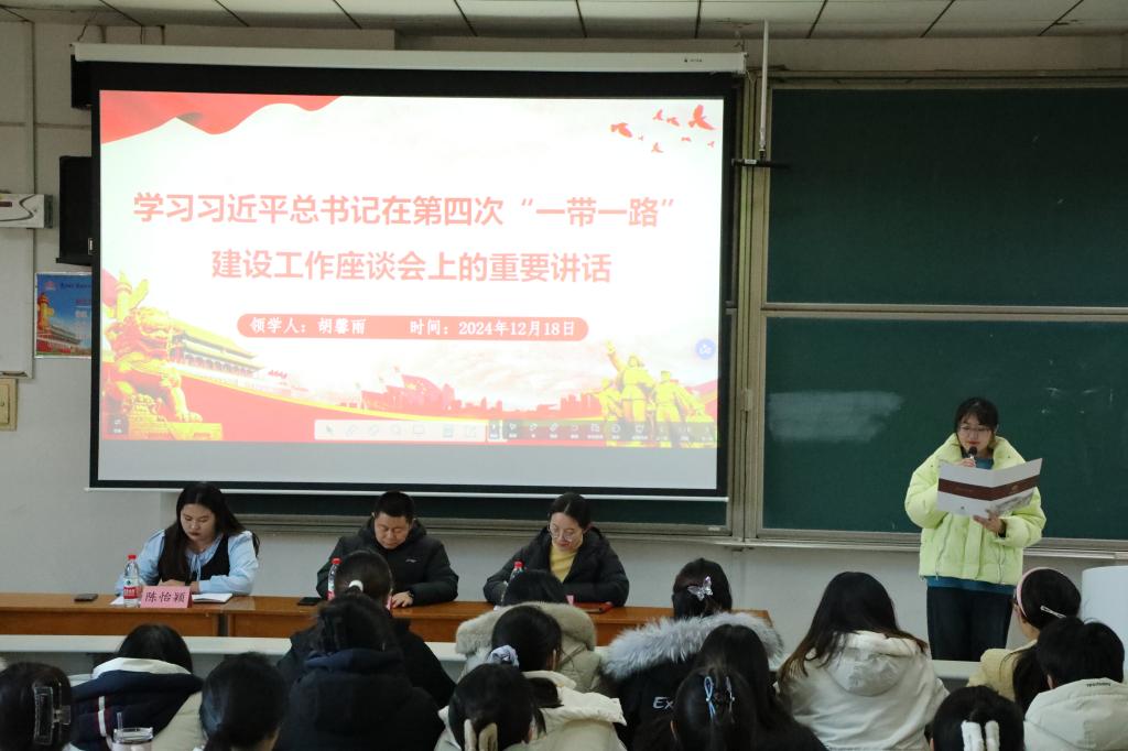 团委组织部副部长胡馨雨带领全体成员学习了习近平总书记在第四次“一带一路”建设工作座谈会上的重要讲话,使同学们深刻认识到“一带一路”自倡议以来取得的丰硕成果,及其对构建人类命运共同体作出的突出贡献。这对于学生干部深刻理解国家战略、增强社会责任感、开拓国际视野具有重大指导意义。
