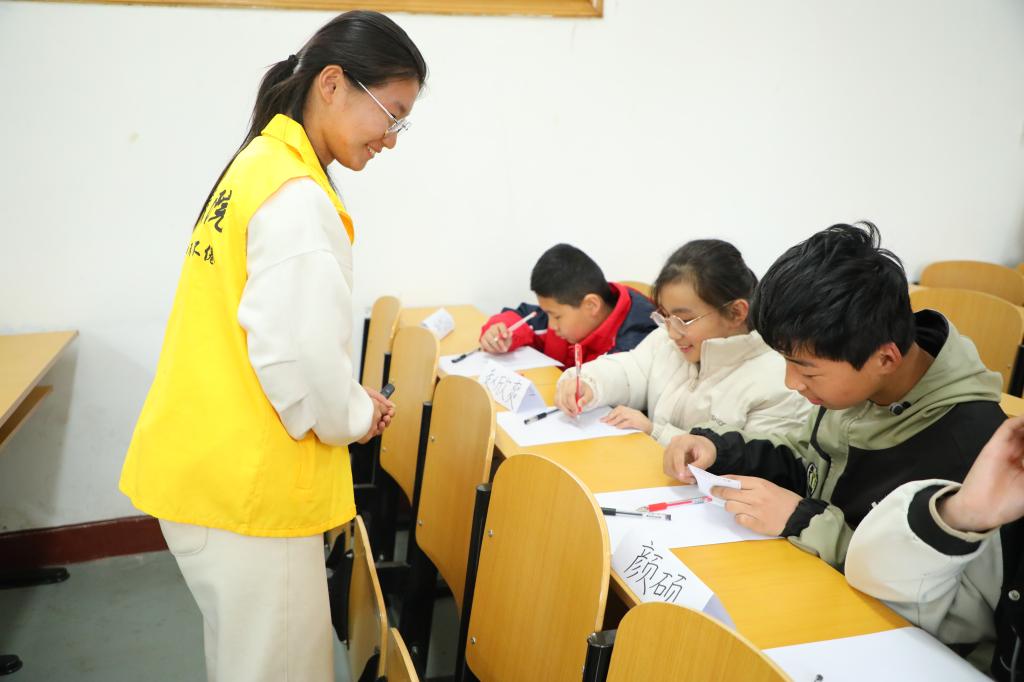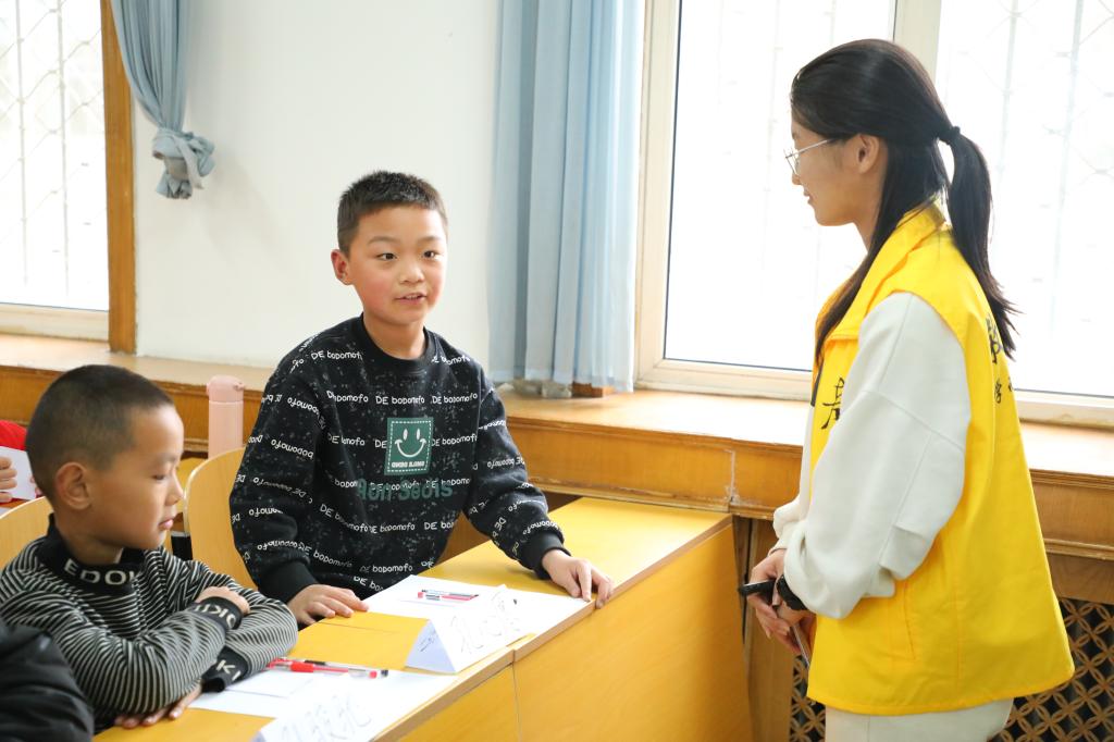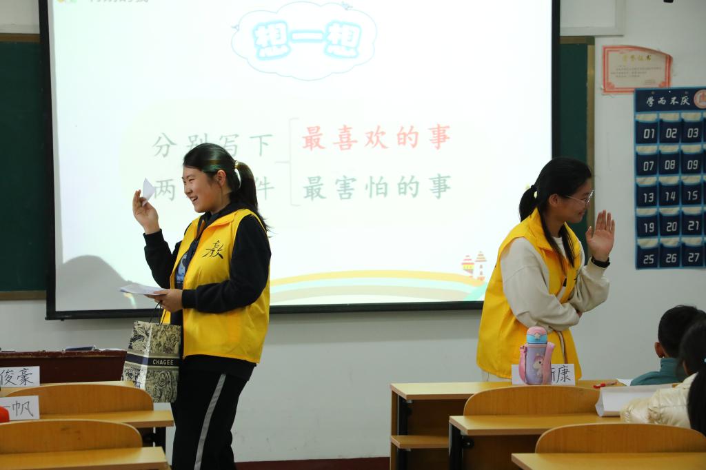 于子桐、田依凡等师范生组成的志愿服务队,为20余名困境儿童集中讲授自研开发的儿童社交课程——“特别的我们”。她们以“特别的我”、“特别的人”两个互动活动引导孩子们认识独一无二的自己,了解身边对自己重要的人。课堂上,小朋友们认真听讲、积极参与,志愿者们循循善诱、耐心指导,双方热情互动,建立了信任与友谊,教室里充满了欢声笑语。