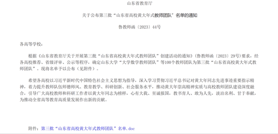 据悉,第三批“山东省高校黄大年式教师团队”的评选,经各高校推荐、省级评审、公示等程序产生,全省共有100个教师团队入选。