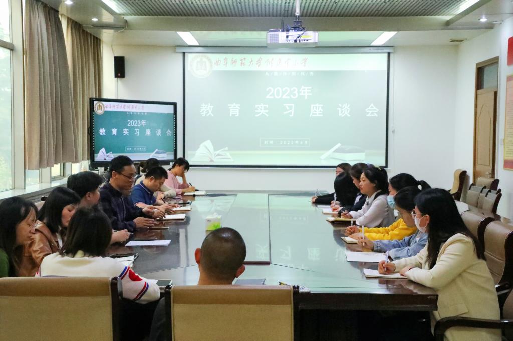 领导、老师以及实习生代表与曲阜师范大学附属中小学领导、实习指导教师进行了座谈,就实习安全、实习开展、实习生管理等具体工作展开深入交流。