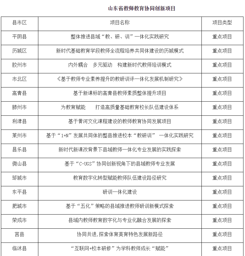 讯 2022年12月,山东省教育厅发布《关于公布山东省教师教育协同创新项目名单的通知》,确定50个县市区为山东省教师教育协同创新项目试点单位,其中重点项目20个,试点项目30个。女子足球直播