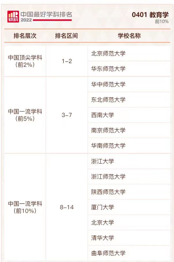 讯 2022年9月21日,高等教育评价专业机构软科正式发布“2022软科中国最好学科排名”,教育学学科排名共有73所大学上榜,曲阜师范大学排名第14,入围前10%。